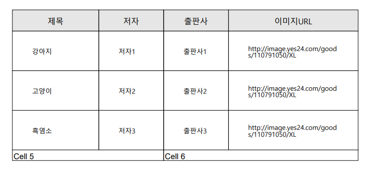 {"강아지", "저자1", "출판사1", "http://image.yes24.com/goods/110791050/XL"},